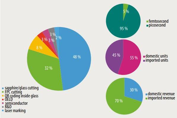 在半导体、显示器制造和玻璃加工需求的推动下,中国的超快激光市场正在快速增长。2021,超过45家制造商在中国共售出2400台激光器。销售的超快激光器中95%是皮秒激光器。飞秒激光只占据了很小的市场份额。国产激光器占总销量的55%,但仅占总收入的30%,这表明国产超快激光器的功率水平较低,大多在10至50瓦之间,而进口激光器则用于更高功率的应用。