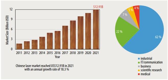中国激光市场是世界上最大的工业激光市场。回顾2020年,中国激光产业全年实现了10个百分点的正增长,远远超出预期,2021中国激光产业继续保持增长趋势。2021,该国激光设备市场的总体规模同比增长18.3%,达到创纪录的129亿美元(图1)。在中国从旧的低技术产业向新的高技术产业转型的过程中,激光技术的应用已成为许多制造业提高产品质量、降低成本、最终提高竞争力的关键。
