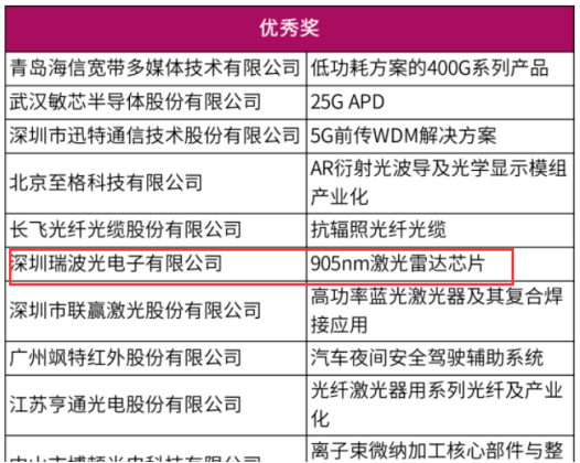 深圳瑞波公司已开发出超过11款的905nm EEL芯片产品,产品功率包括6W/15W/25W/50W/75W/100W/140W,技术指标达到国际先进水平,同时实现905nm脉冲激光芯片的规模化生产和批量上市,广泛应用在车载激光雷达、机器人激光雷达、无人机激光雷达、测距望远镜等领域,已成为国内领先的905nm激光芯片供应商。本次获奖是对瑞波光电技术实力和市场化能力的充分肯定和鼓励,未来瑞波将面向下一代激光雷达开发更多新品来满足市场需求。