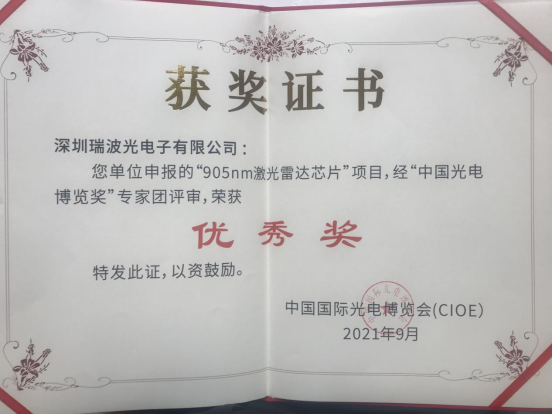 该奖项征集得到了广大参展企业的高度关注与积极参与,经三轮专家团评审并报主席团审核,有效参评项目97项中共有37个参评项目入围,最终34个项目参与了9月15日在展馆现场举行的“中国光电博览奖”现场评审。现场评审团成员包括全国政协委员、教科卫体委员会副主任、科技部原副部长曹健林先生,中国科学院顾瑛院士、骆清铭院士,工信部通信科技委专职常委、亚太光通信委员会主任毛谦等十余位专家,经过一天的现场评审并最后审核,最终决出2021年“中国光电博览奖”获奖名单。瑞波光电经过激烈角逐,成功凭借905nm激光雷达芯片获选“中国光电博览奖”之优秀奖。