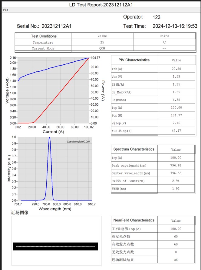 测试功能齐全,可在脉冲电流注入下自动测试LD的LIV特性、光谱特性、远场特性、近场特性
