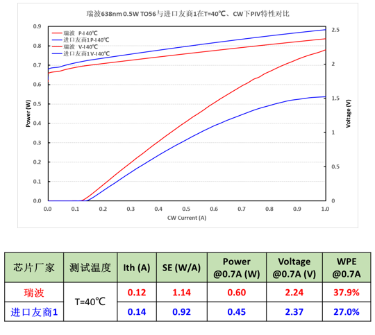图1: 638nm 0.5W TO-56与进口友商1在T=40℃、CW下PIV对比数据