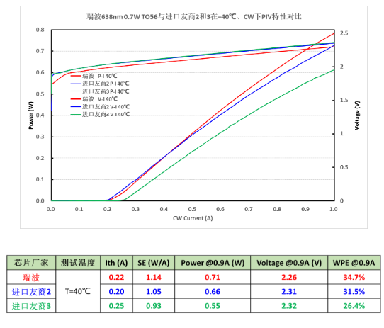 图2:638nm 0.7W TO-56与进口友商2和3在T=40℃、CW下PIV对比数据