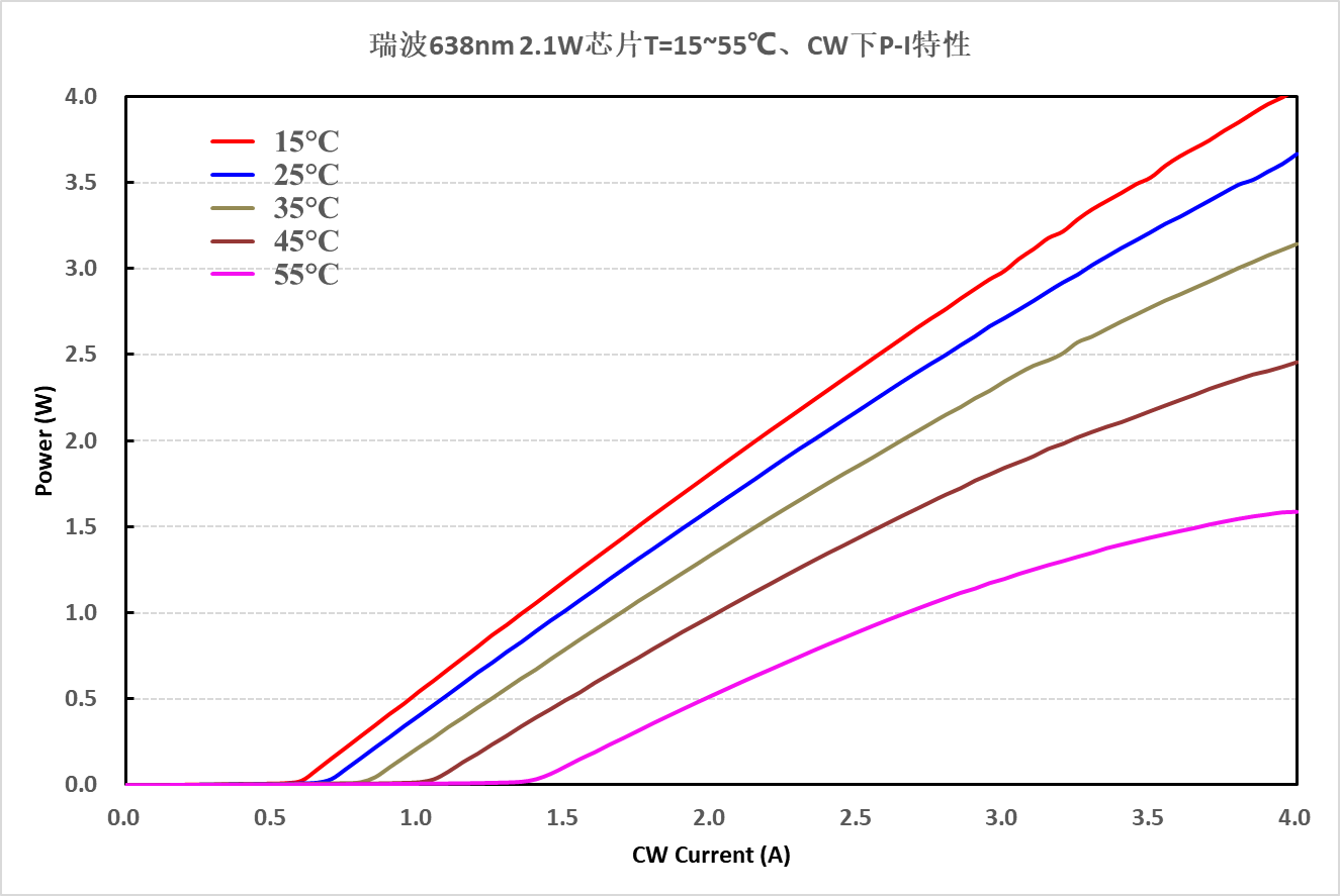 638nm高功率激光芯片和器件,长期以来一直被日本公司垄断,其产品具备高功率、高效率和高温特性好的优势,国内多家单位一直致力于国产化突破。通过不懈的努力,瑞波新一代638nm激光器件在在关键性能参数上提升显著: