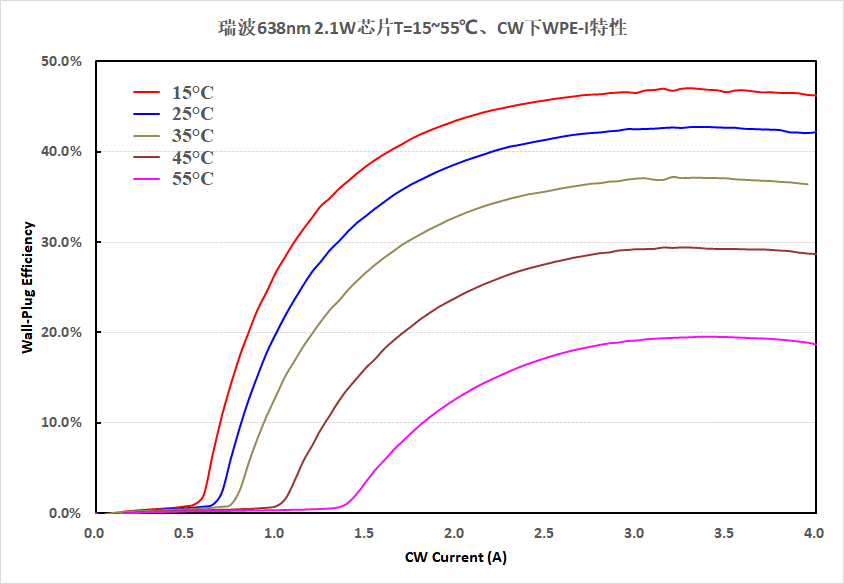 图3 瑞波638nm 2.1W COS在不同温度下的P-I和WPE-I曲线