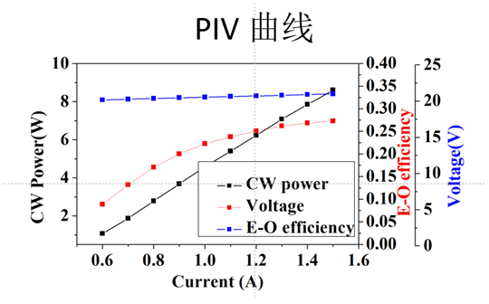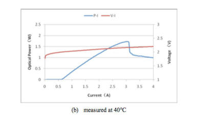 图3:课题组一为该项目已开发出红光LD芯片及PIV曲线,室温和40摄氏度(发表于ICDT-2018)