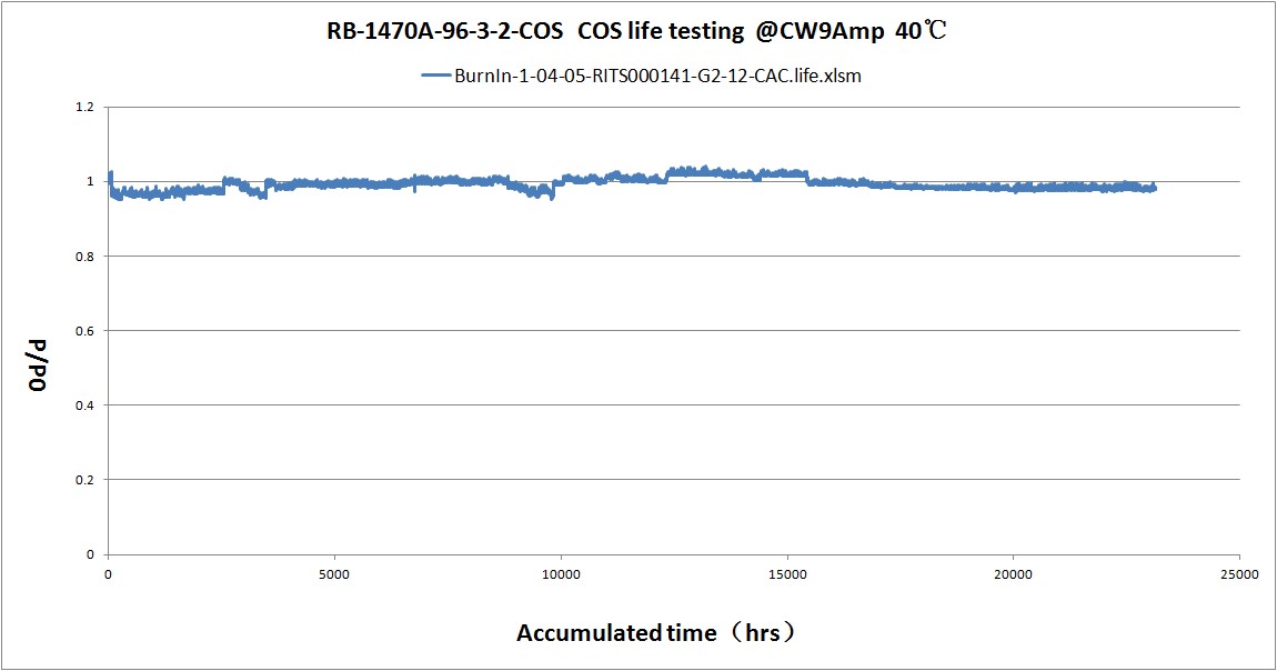 瑞波光电早在2015-2016年就开发出的1470nm系列大功率激光芯片,是瑞波开发的最为成熟的产品之一,技术指标达到世界领先水平,其中3.5W 1470nm大功率芯片突破美国对中国的禁运功率,截止到目前,单管1470nm的寿命测试时间已经积累20000小时(还在持续中)多小时(老化条件9Amp,40℃):无芯片失效!。