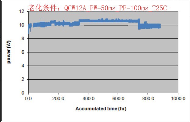 图2:808nm 190μm发光区域宽度、4mm腔长的芯片,封装为COS后在10W连续输出功率下的长期老化测试情况, 7个COS器件的老化时间累计超过2.8万器件小时,无器件失效而且功率稳定。