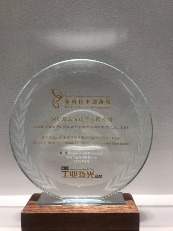 2021年9月10日,一年一度的 “激光行业――荣格技术创新奖 ”年度颁奖典礼在上海成功举办。经过激烈的网络用户投票及行业专家评选,瑞波光电继2020年后,凭借“用于掺铥(Tm)光纤激光器泵浦的793nm EEL”再度荣膺“2021激光行业――荣格技术创新奖”。