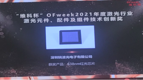 2021年9月24日,OFweek Laser Awards 2021行业年度颁奖盛典在深圳大中华喜来登酒店举行。瑞波光电凭借开发的大功率638nm红光芯片成功赢得“OFWEEK激光元件、配件及组件技术创新奖”。
