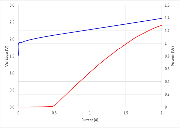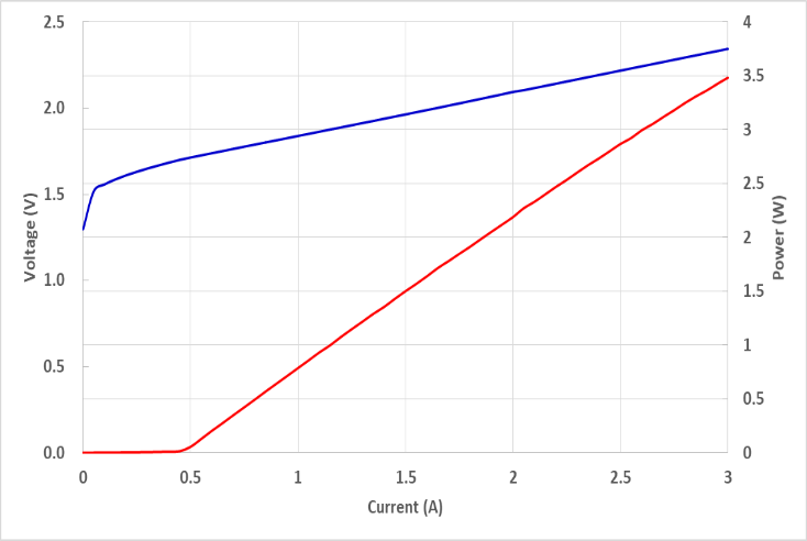 在连续功率808nm器件方面,瑞波光电开发了3W TO9器件,可用于激光照明和医美领域,型号RB-808B-150-3-1-TO9,工作电流2.6A,工作电压2.3V,斜率效率1.4W/A.
