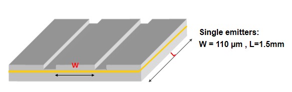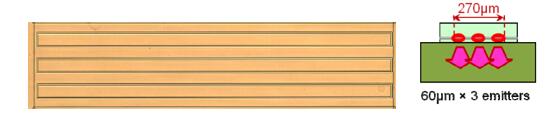 其中1 W 638 nm芯片采用110 µm发光条宽,腔长 1.5 mm的尺寸结构(见图3),而2.5W 638nm芯片则采用三个发光点,每个发光点条宽为60µm、腔长1.5mm的尺寸结构(见图4)。