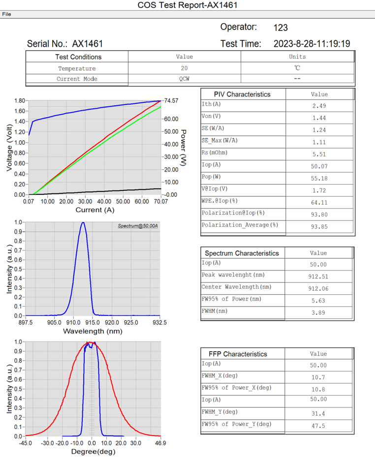 3、测试功能齐全,可在连续或者脉冲电流注入下自动测试LD的LIV特性、光谱特性、远场特性、偏振特性