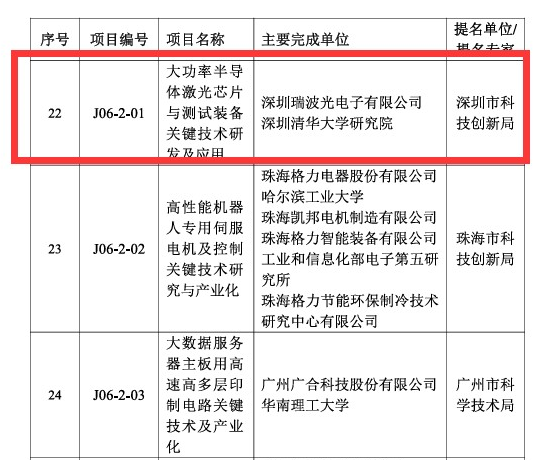 2024年10月17日,广东省人民政府颁发了2023年度广东省科学技术奖的通报(粤府〔2024〕54号),瑞波光电作为第一完成单位申报的《大功率半导体激光芯片与测试设备关键技术研发及应用》技术研发项目获得2023年度广东省科学技术奖科技进步二等奖。